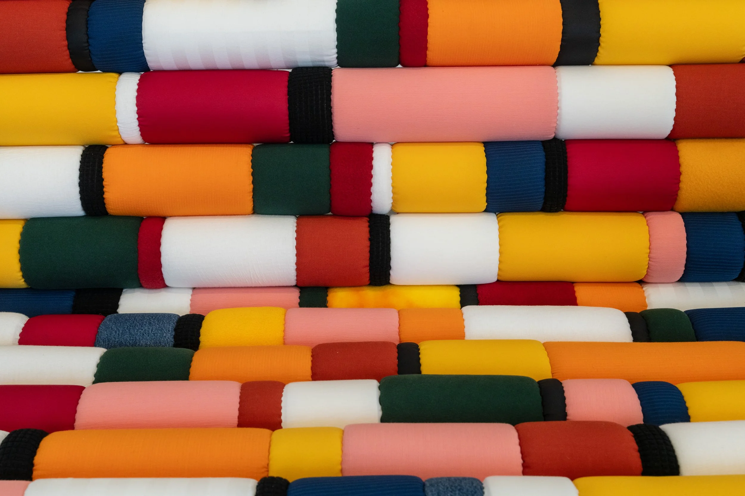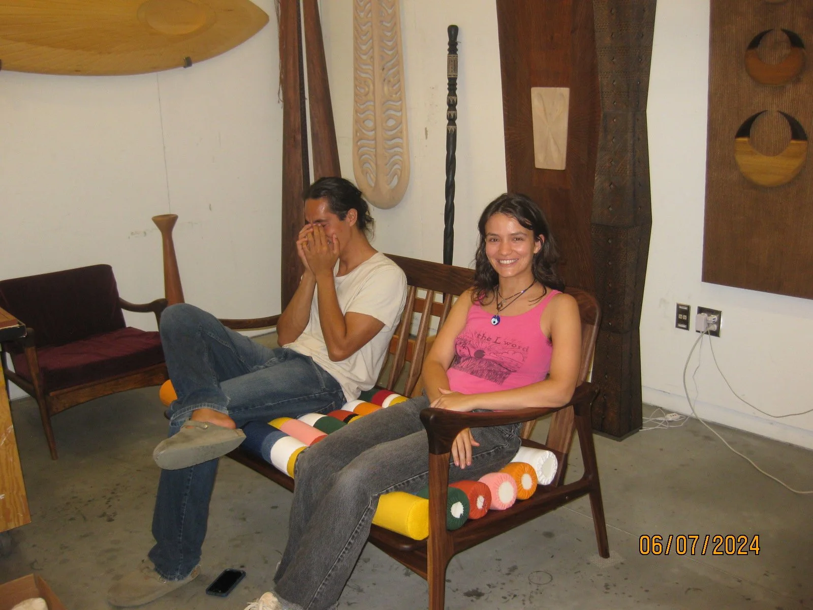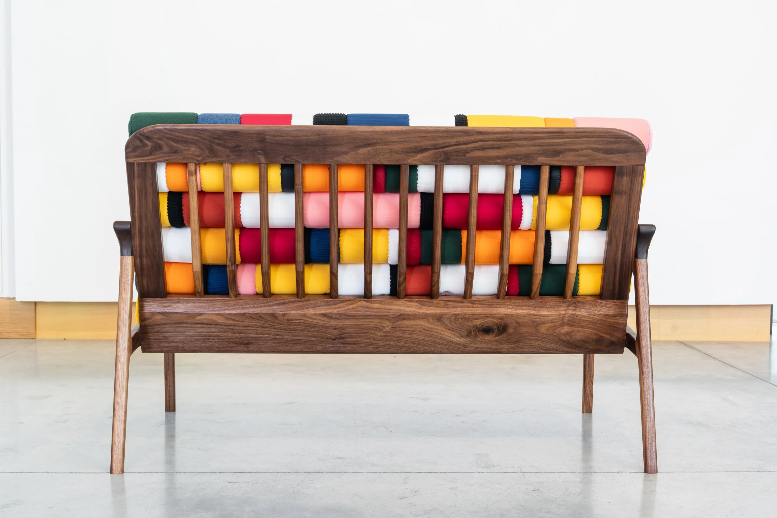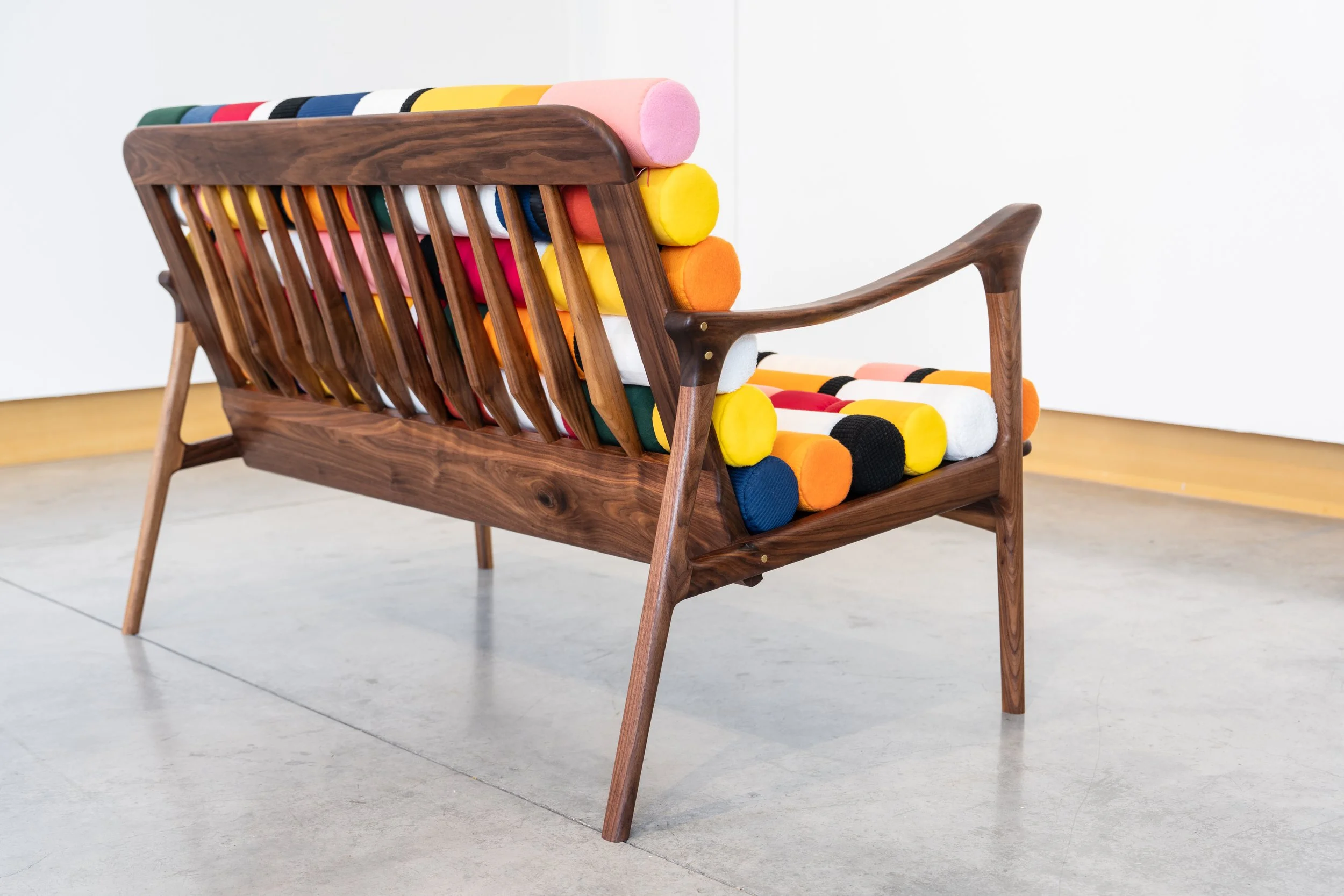 After receiving the POD award alongside my classmate Isaac Letoa, we decided to work together on a collaborative centerpiece for our two-person show scheduled the following summer. We conceived of and designed together a couch that would showcase our complimentary skillsets and aesthetics: Isaac’s smooth and intricate wood sculpture with my own eclectic and colorful textile work. The frame is made of walnut with mortis and tenon joinery and brass pins. The cushions are made with individually cut tubes of upholstery foam, wrapped and sewn with found fabric (denim, cotton, fleece) and hand sewn into columns, then threaded into solid seat and back units.