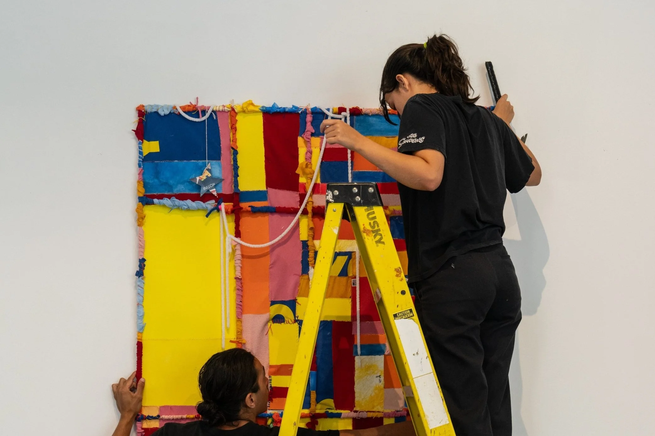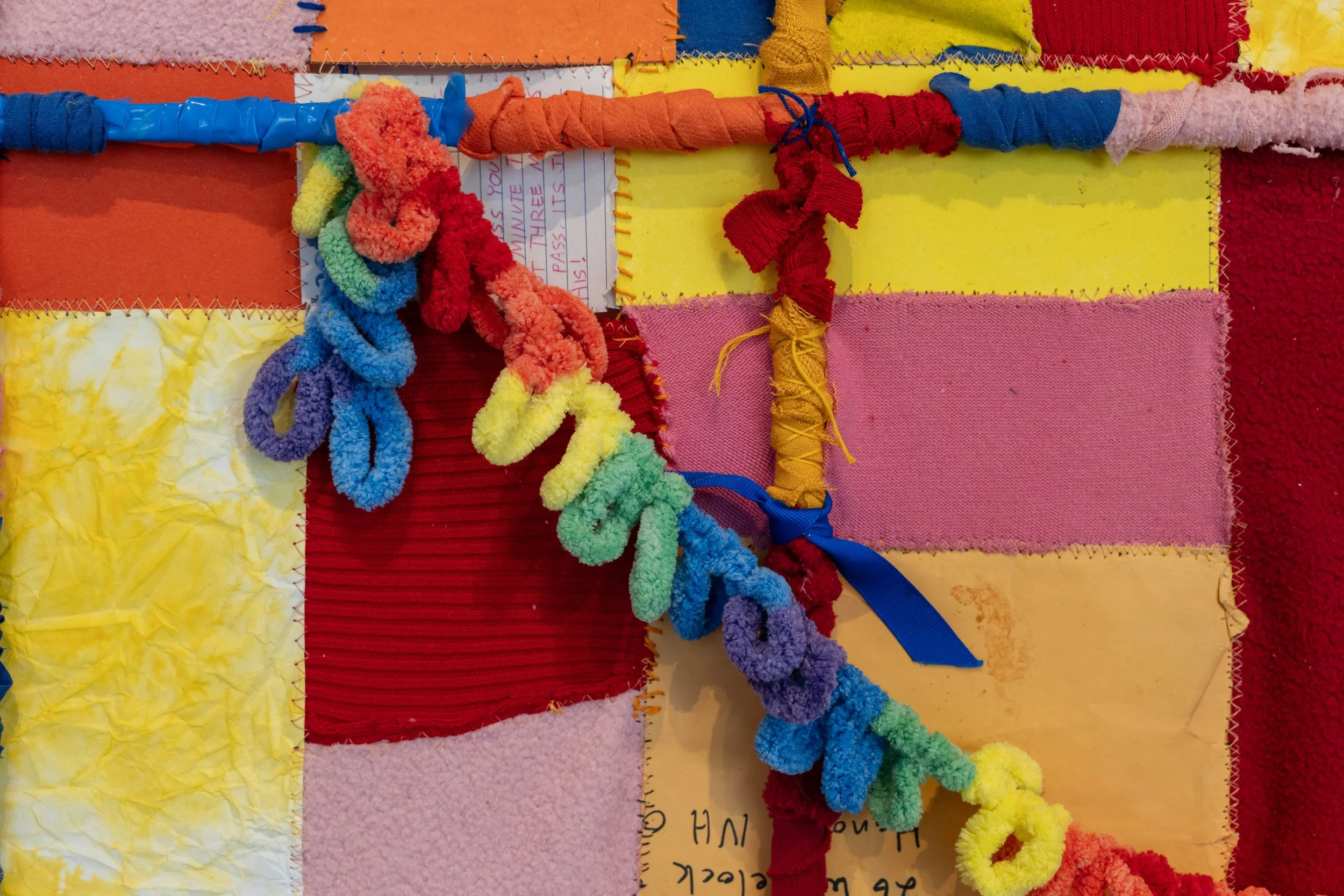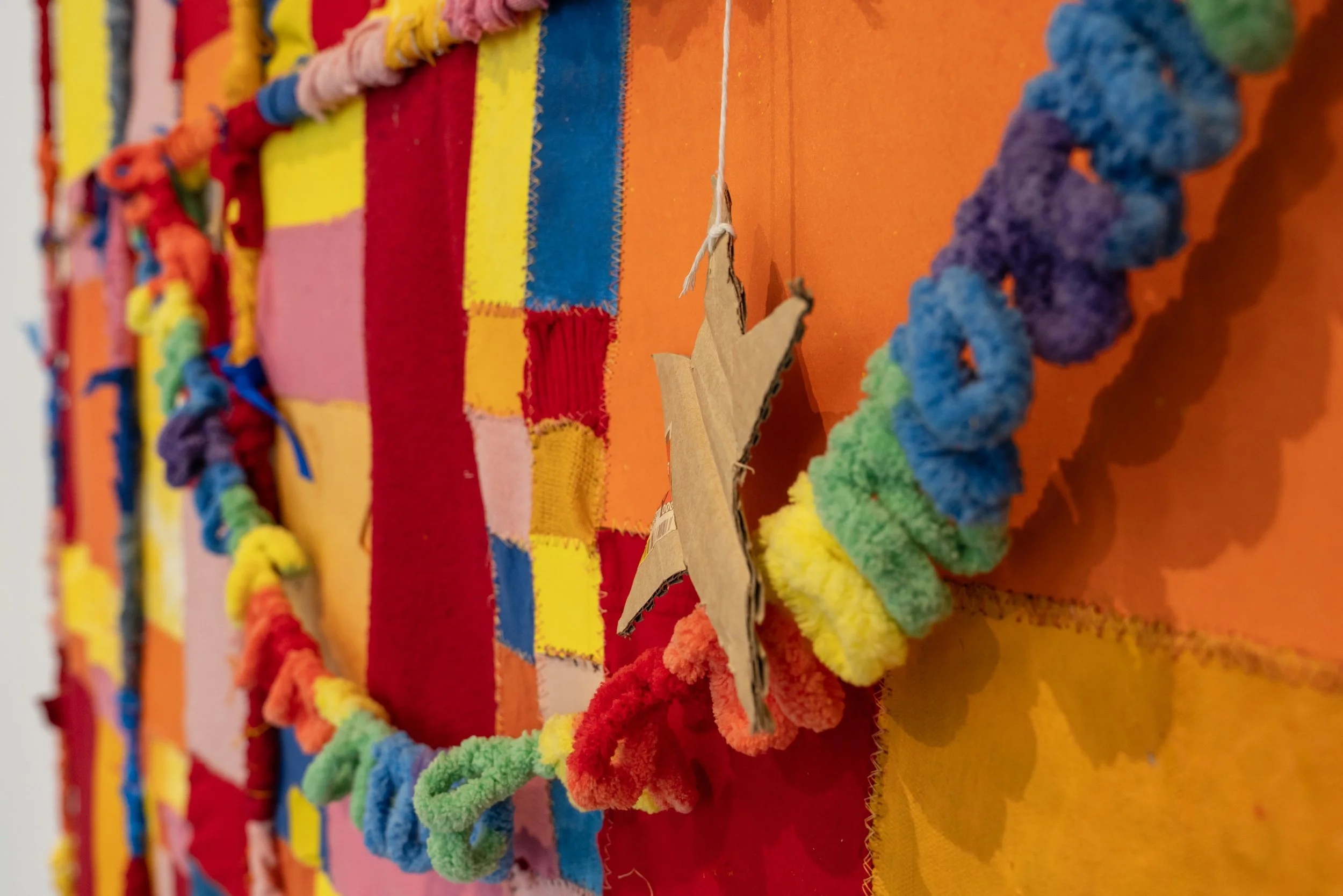 made with found textile (including an orange Axiom Medical tote bag, a bright pink Talbots golf shirt, a pink sweater I’ve had for about six years, and Eli’s Brooklyn Museum Oy Yo shirt), inked and dyed paper, old letters, oil painted canvas, cardboard stars that have been hanging in my room for over a year, acrylic yarn that did the same; wooden dowels wrapped in paper and fabric, yarn and embroidery thread.